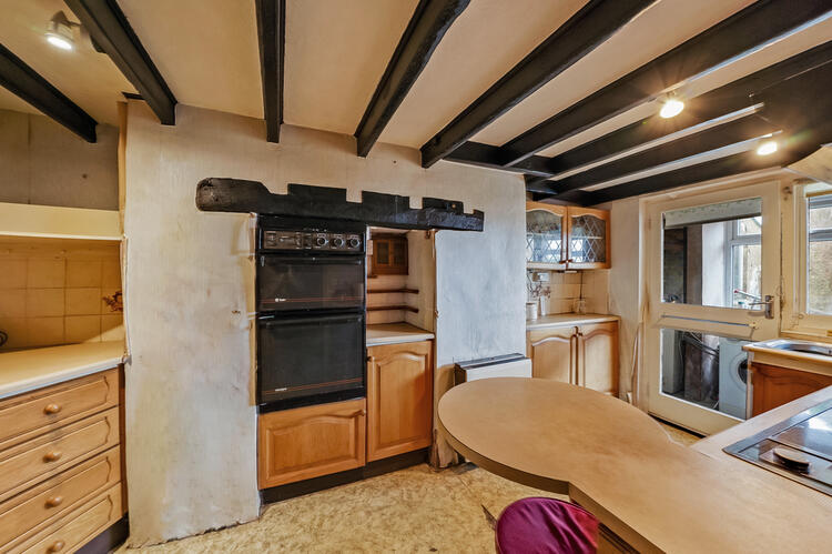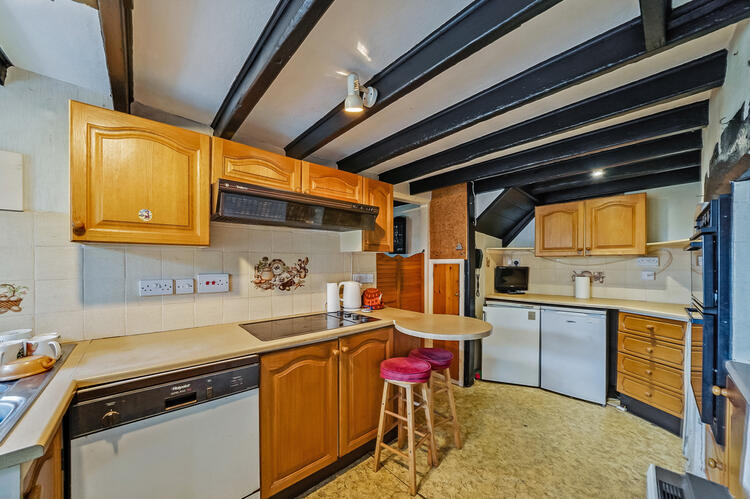 Fitted with a small range of units and space for appliances. Plumbing for dishwasher. Access to understairs storage which still has the flap in the stairs which was used to see when customers had come into the shop. Large chimney recess and door to rear storage and utility area