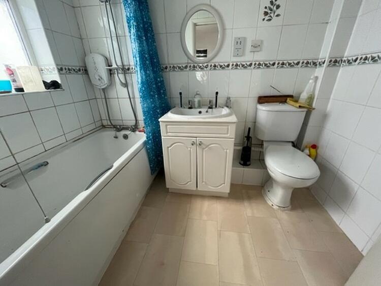 Having a white 3 piece suite comprising low flush w.c. wash hand basin and panel bath with shower over. Tiled walls, extractor fan and window to side.