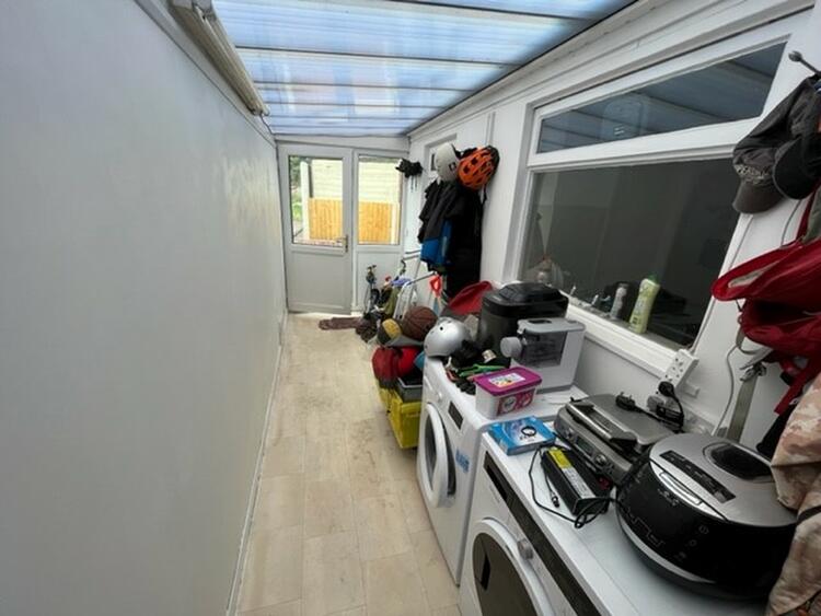 With plumbing for washing machine, space for boots and coats and door to rear.