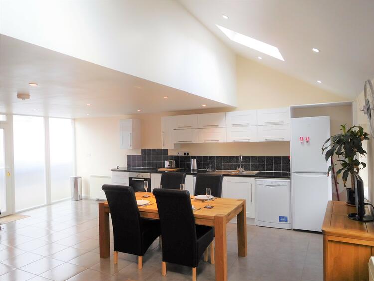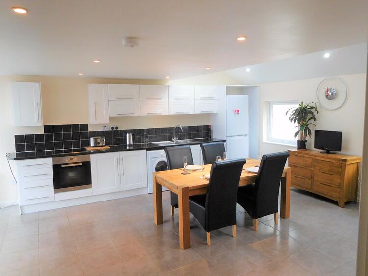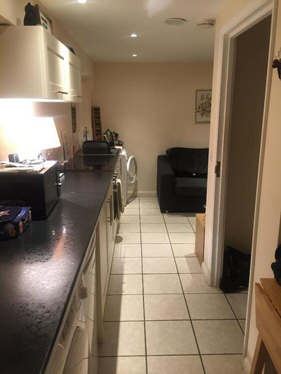 Bright, modern area comprising a range of base units and wall units, a long work surface with tiled splashback, sink with mixer tap and drainer, integrated oven with a four-ring electric hob. In addition to the two full-length frosted windows adjoining the front door, are two additional double-glazed windows and two Velux windows. Tiled floor, recessed ceiling spotlights, numerous double plugs and an aerial point. Storage Heaters. Stairs to the top-level floor and middle-level floor.