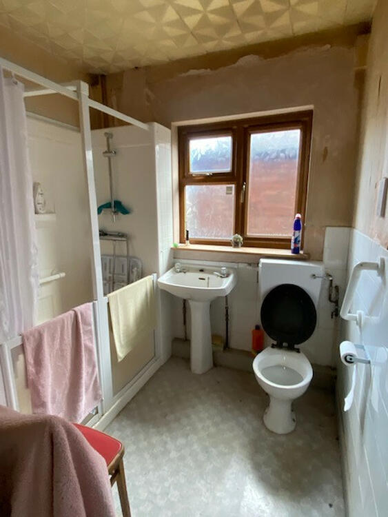 With a walk-in disabled shower, low level wc, pedestal wash hand basin, tiling to walls and obscure uPVC double glazed window.