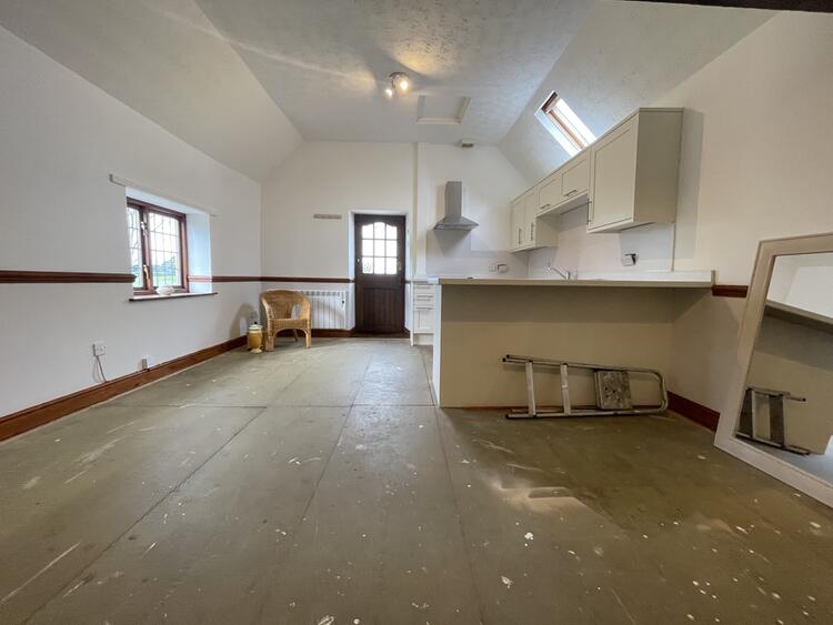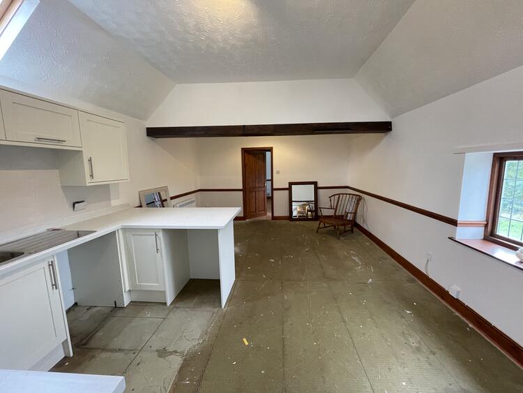 With double glazed window to the front elevation and enjoying far reaching countryside views. A recently fitted shaker style kitchen in white units comprises a range of wall mounted cupboards with matching base units, L-shaped preparation surface with stainless steel sink and drainer, mixer tap and splashback tiling. There is a stainless steel built-in oven with hob and cooker hood over. There is also loft access and exposed beam.