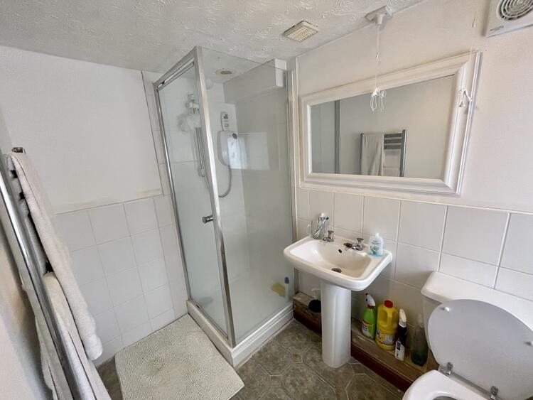 Comprising a roof light with shower cubicle, low level wc, wash hand basin, laddered heater towel rail and tiling to walls.