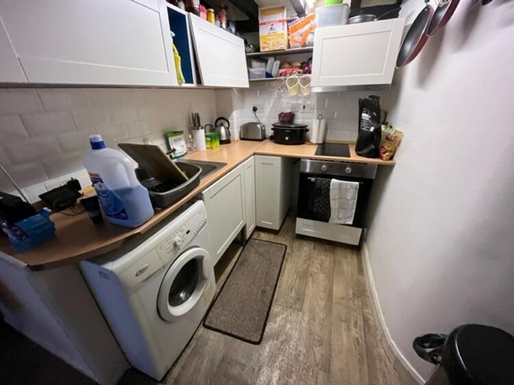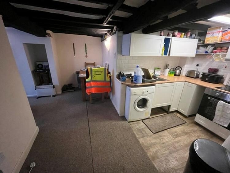 With a range of kitchen units, sink, built in over, hob and extractor. Space for table and chairs and under stairs pantry.
