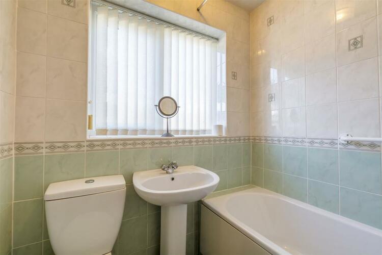 Three piece suite comprising bath with Gainsborough electric shower over, wash hand basin with mixer tap and push flush w.c. Fully tiled walls, radiator and double glazed window to the side with fitted blinds.