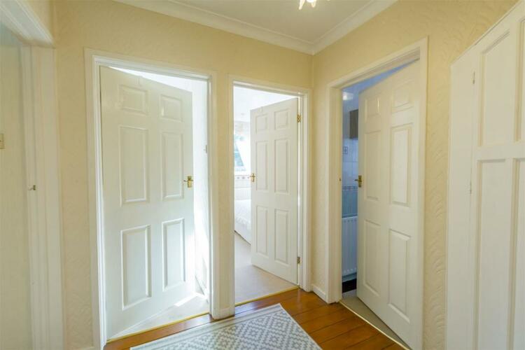 Coving, loft access hatch, exposed and varnished floorboards, doors to all bedrooms and bathroom and storage cupboard.