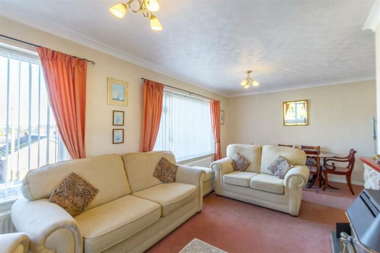 Two double glazed windows to the front with fitted blinds offering far reaching views beyond, additional double glazed window to the side with matching fitted vertical blinds, two radiators, ample space for dining table and chairs, coving, media points and brick and slate fireplace incorporating coal effect fire with back boiler behind.