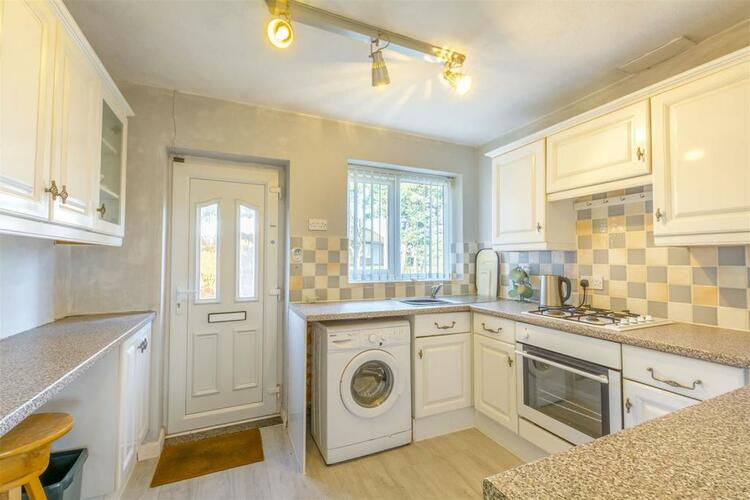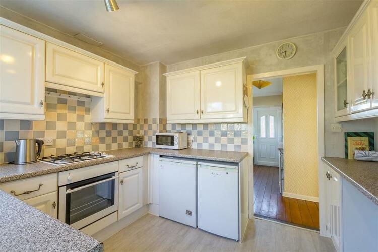 The kitchen comprises a matching range of fitted base and wall storage cupboards with marble effect roll top work surfaces incorporating counter level four ring gas hob with extractor over and oven beneath, inset single sink and drainer with mixer tap and tiled splashbacks, plumbing for washing machine, space for under counter fridge and freezer, breakfast bar area with space for 2/3 bar stools, glass fronted crockery cupboards, double glazed window to the side with fitted vertical blinds, uPVC panel and double glazed side exit door.