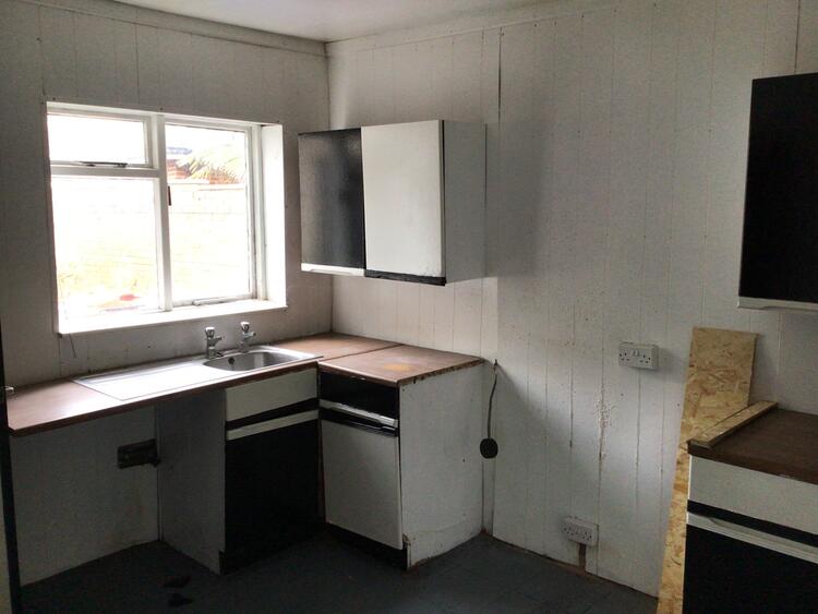 The partially fitted kitchen comprises base units with drawers, wall mounted cupboards, laminate work surface, single bowl stainless steel sink and single drainer. Sliding door leading to stairs to the first floor. Door leading to the inner lobby which in turn leads to the bathroom and a door leading to the rear garden.