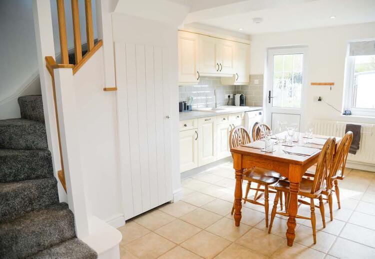 Entered via a fully glazed door. The bright space has ample space for a table and chairs, window to the rear, double glazed door to the garden and turning staircase rising to the first floor. Fitted with a range of cream wall and base units with contrasting work-tops, inset ceramic sink with mixer tap, integrated electric oven, ceramic hob, stainless steel extractor hood, slim-line dishwasher and refrigerator. Space and plumbing for a washing machine, large under-stairs cupboard, contemporary style tiled splash backs, ceramic tiled floor, recessed spot-lighting, radiator.