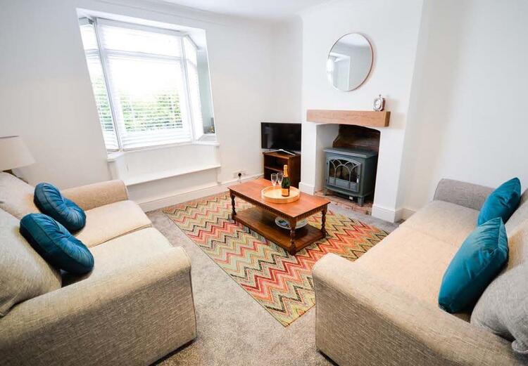 Feature fireplace with beam and brick fire back and hearth. We are informed by the seller that there is a flue liner in place to allow the installation of a wood-burning stove. Recessed spot-lighting, window with window seat and radiator.