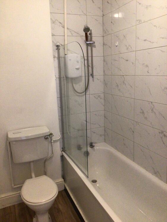 Please note this is an irregular shaped room. With three piece bathroom suite with over bath electric shower.