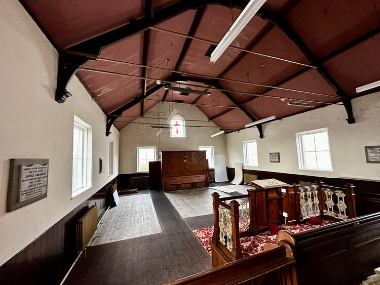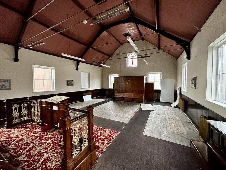 At some stage, the Chapel was extended to the rear with a two-storey addition, providing lower ground floor space, together with Assembly Room and Vestry to the first floor. The Chapel is open to eaves, and has suspended timber floor with hardwood screen facing the front entrance doors. To the rear of the Chapel is a raised Altar, beyond which are two rooms leading to the Assembly area and Vestry. There is a kitchen and WC, and external staircase leading to the rear grounds. There is access through to storage areas, former coal store, and boiler room. Externally, the property is set back from Alfreton Road, and a brick wall forms the boundary to the pavement, with gated access and a ramp leading to the front entrance. There is a passageway to the side, and to the rear is a parcel of land with a southerly aspect.