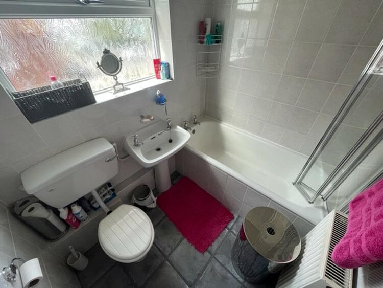 With white suite comprising of low flush w.c. wash hand basin and panel bath with shower over. Radiator, part tiled walls and window to side aspect.