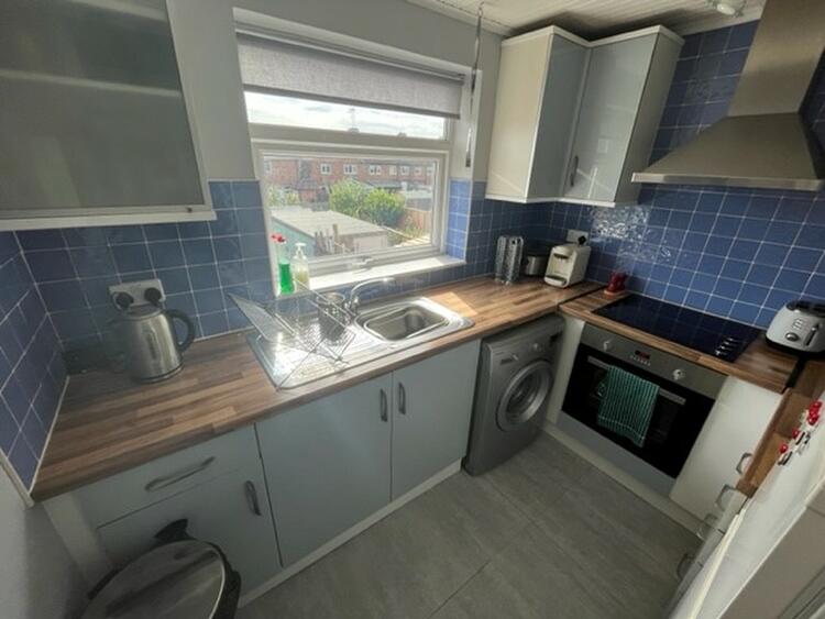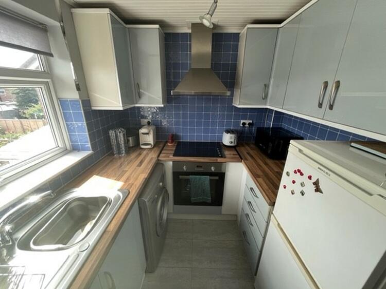 With a range of modern base and wall units, work surfaces, sink, built in oven, hob and extractor. Space for appliances and window to rear.