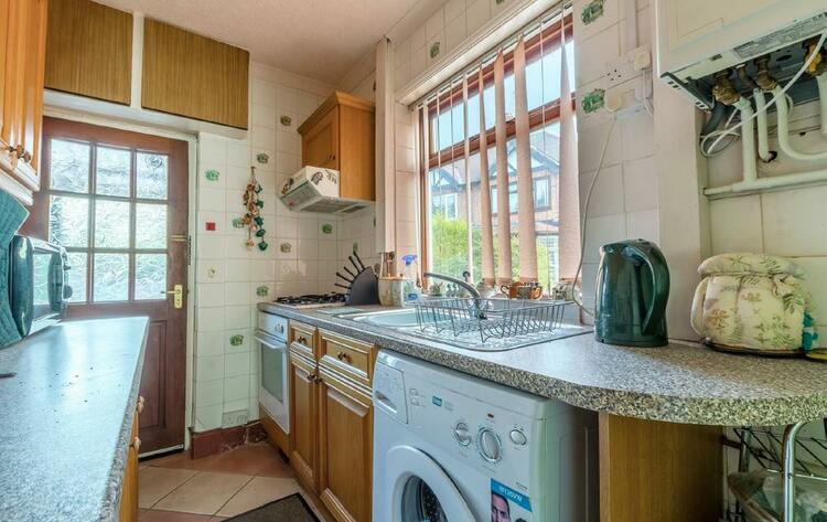 With a range of wall, base and drawer units, worksurfaces, sink with drainer and a mixer tap, integrated electric oven with gas hob and air filter over, space for a fridge, plumbing for a washing machine, tiled flooring and walls, double glazed window to the side, wall mounted combination boiler, pantry and door to the rear entrance.