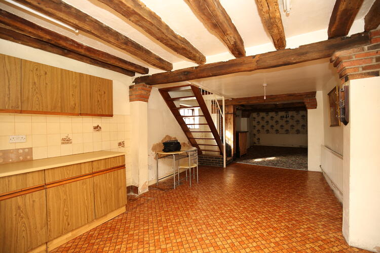 Having windows to front and side aspects, stairs leading off to the first floor landing, single panelled radiator, fitted base and eye level units, work tops, appliance spaces, exposed beams and open plan through to the lounge