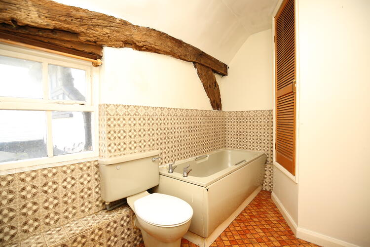 Window to side aspect, low level WC, pedestal wash hand basin, panelled bath, tiled splash backs, exposed beams and a door to the airing cupboard.