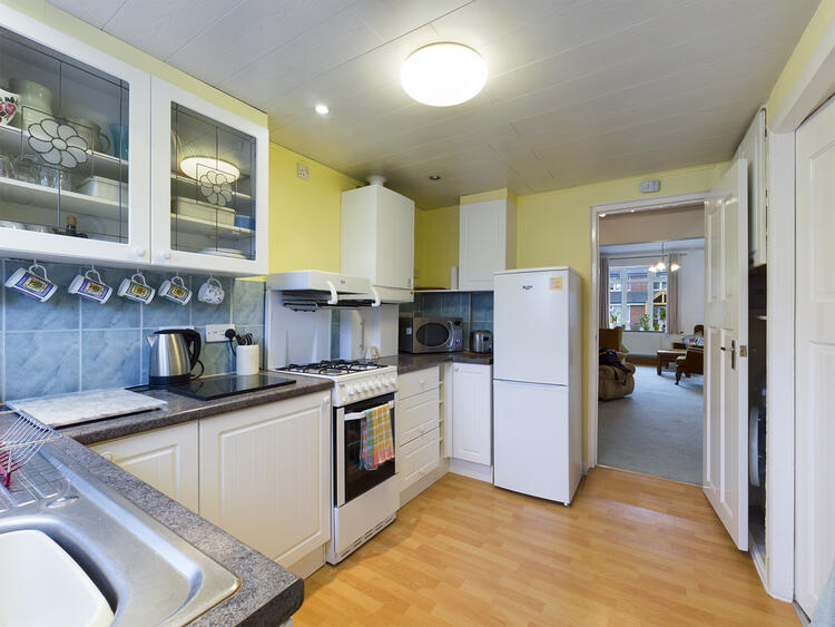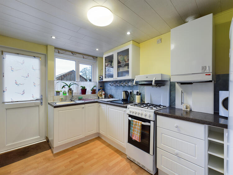 The kitchen is fitted with a range of matching base and eye level units leaving space for appliances with roll edge worksurfaces, inset sink unit and tiled splashbacks, uPVC double glazed window overlooking the rear and matching rear entrance door.