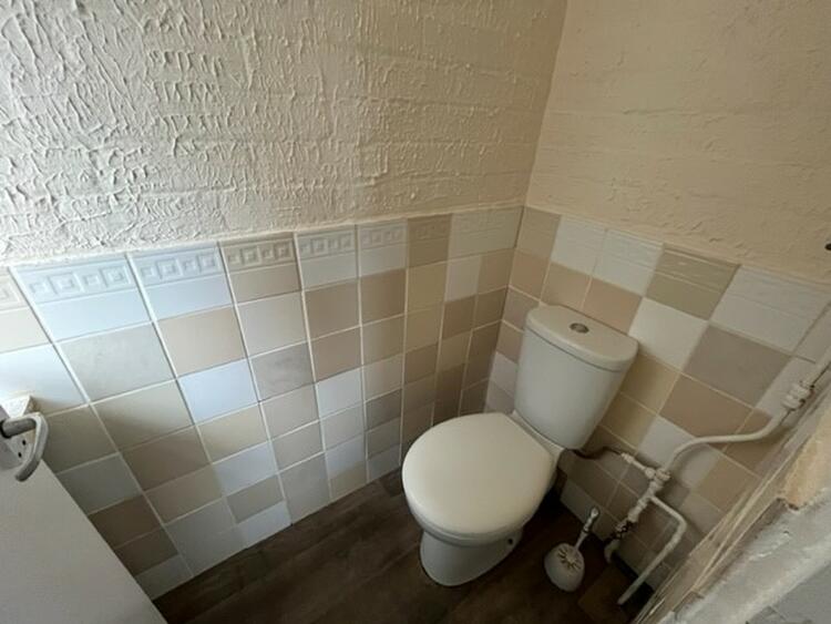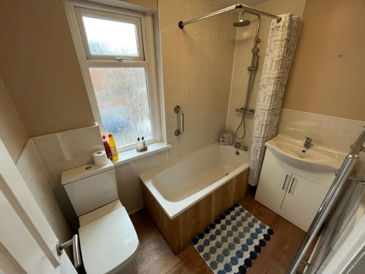 Comprising low flush w.c. wash hand basin and panel bath with shower over. Heated towel rail and window to rear.