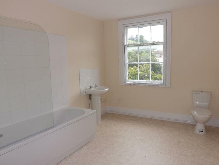White suite of W/C, pedestal basin and bath with mixer shower head attachment over. Radiator. Sash window to rear aspect with secondary glazing. Large cupboard. Vinyl flooring.