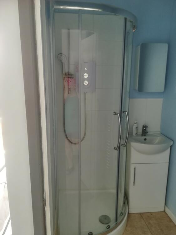 Having a modern white suite. Wash hand basin and corner shower cubicle. Heated towel rail and part tiled walls.