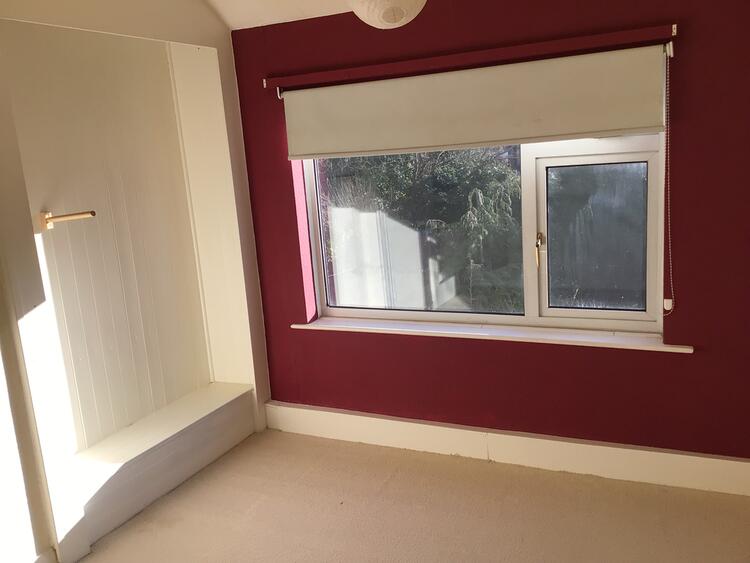 Comprising of hanging rails set to side of the chimney breast with dressing shelf and top cupboards, together with UPVC double glazed window to the front and central heating radiator.