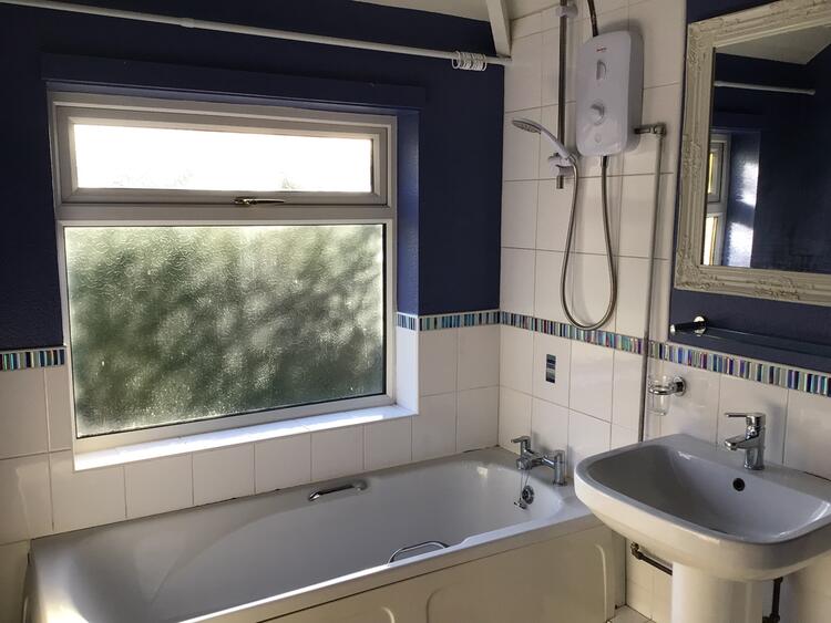 Modern white suite comprising of low level W/C, pedestal wash hand basin and panelled bath with Redring shower unit together with part tiled walls, UPVC double glazed window and central heating radiator.