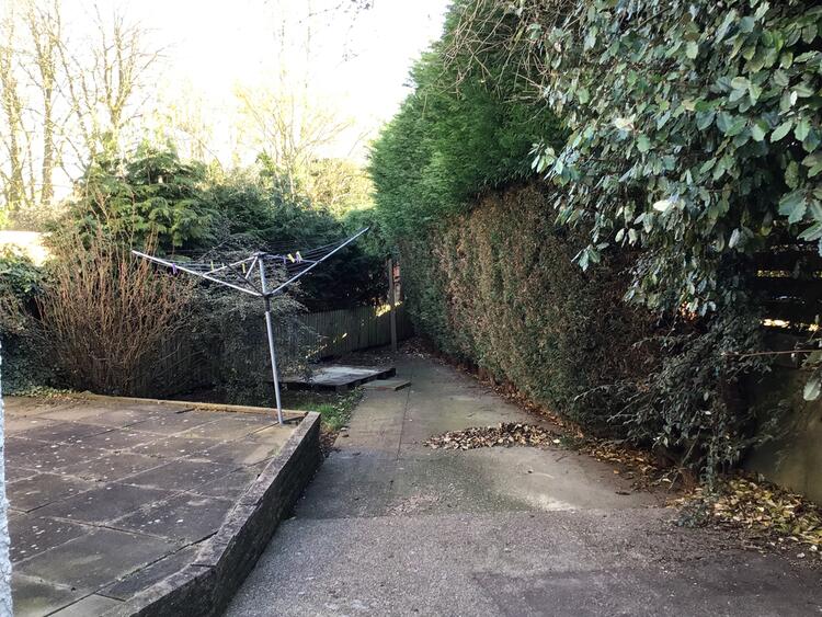 Easily maintained rear garden with raised paved patio, concrete drying area and borders.