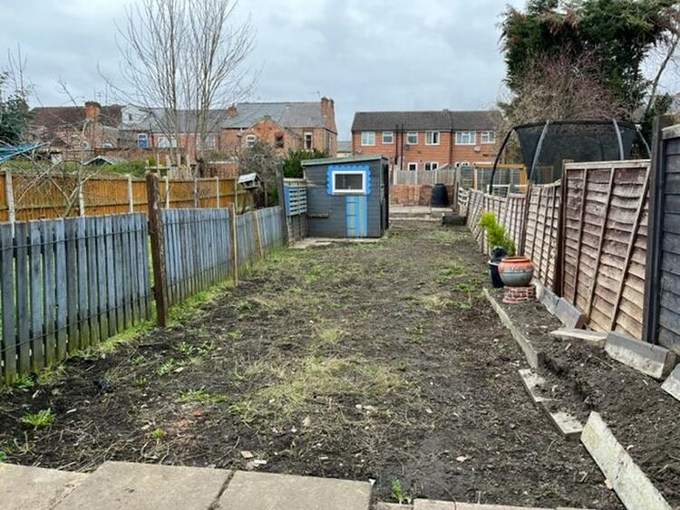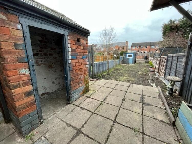 A good sized rear garden with paved patio areas, timber shed and brick store.