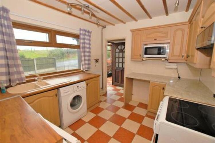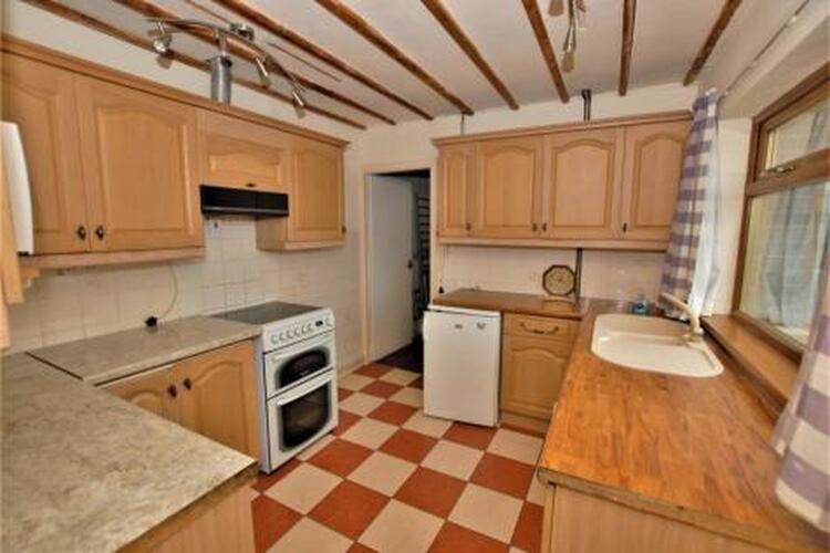 With a uPVC double glazed window to the side elevation, featuring a range of matching base and eye-level storage cupboards and drawers with wood block effect roll top preparation worksurfaces, 1 and 1/2 composite sink and drainer with mixer tap, space for further freestanding appliance/white goods, central heating radiator, door leading to: