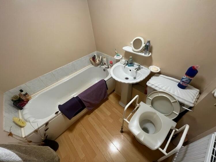 With white suite comprising low flush w.c. wash hand basin and panel bath. Part tiled walls and extractor fan.