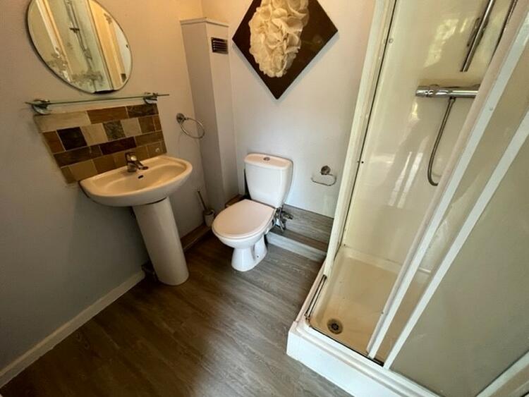 Having a white suite comprising low flush w.c. wash hand basin and corner shower cubicle. Radiator, extractor fan and space for washing machine in understairs recess.