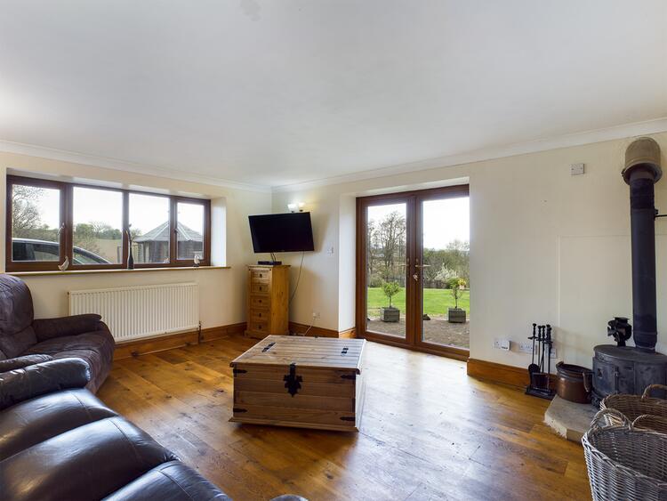15ft 8 x 13ft (4.78m x 3.96m). A lovely light room with uPVC woodgrain double glazed window to side aspect, woodgrain uPVC double glazed French doors to rear and small front aspect. Wood effect flooring. Radiator, power points, wall light points. Corner woodburning stove on a slab earth. Rustic brick arch leading through to: