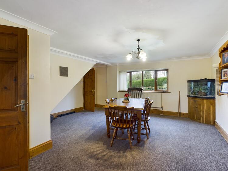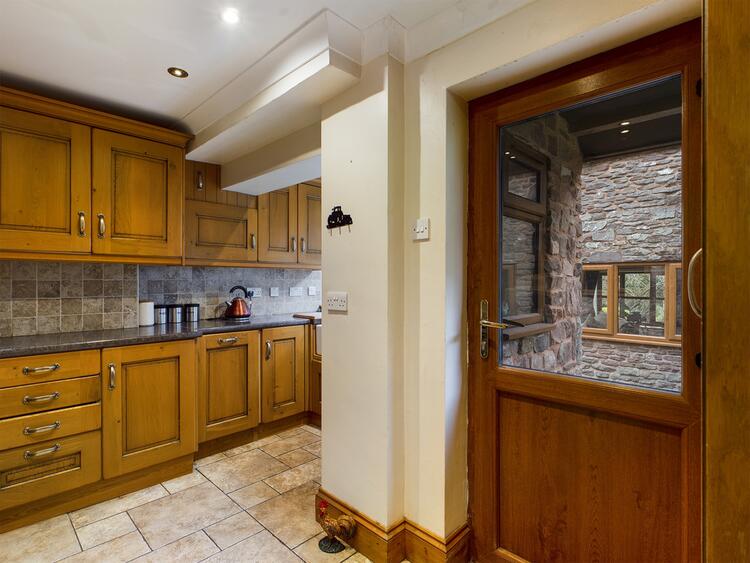 12ft (3.66m) x 6ft 6 (1.98m) and 6ft 7 (2m) x 4ft 1 (1.24m). Fitted with a good range of rustic oak fronted base and matching wall units. Glazed display cupboards. Ample work surfaces with tiled surrounds. Inset Belfast sink. Ceramic hob with cooker beneath and extractor hood over. Space for tall fridge/freezer. Ample power points, radiator. uPVC woodgrain window to rear aspect. Tall larder unit housing oil fired boiler supplying domestic hot water and central heating. Woodgrain double glazed door leading out to rear.