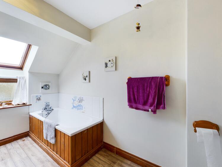 With modern pine panelled bath with mixer tap. Wash hand basin with timber panelling beneath. Low level WC. Ceiling spotlights. Woodgrain uPVC double glazed window to rear aspect with additional velux roof light over giving plenty of natural light.
