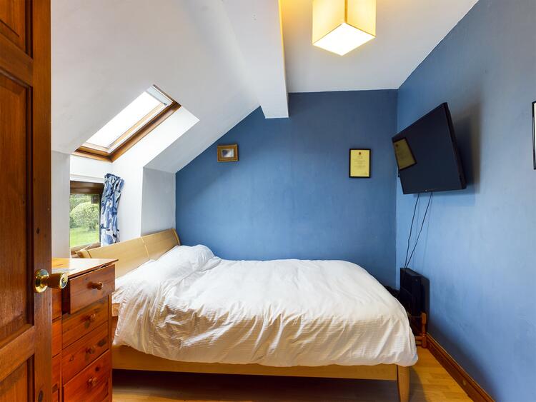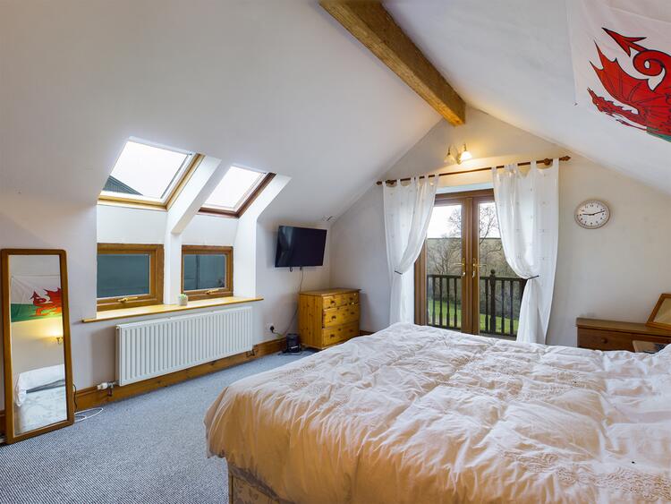 15ft 6 x 13ft (4.72m x 3.96m). A lovely light room with two woodgrain uPVC double glazed windows to front aspect with velux roof light over, additional woodgrain uPVC double glazed French doors to side with small balcony taking advantage of the splendid rural views. Power points, wall light point.