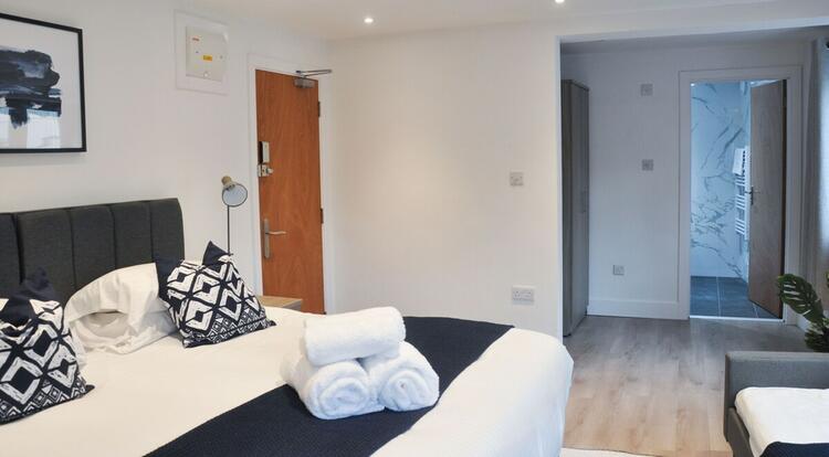 Currently generating an income of £900 pcm (£10,800 pa). 215 Sq. Ft. of accommodation. Includes a double bed, a kitchenette which is equipped with 2 electric hobs, microwave and fridge, and bathroom with shower.