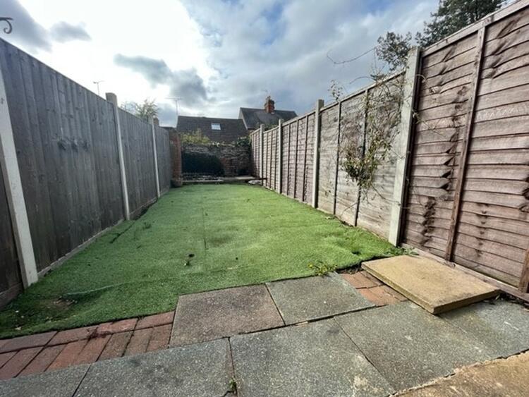 A rear garden having patio, artificial lawn and being enclosed by wood panelled fencing. Shared side access.