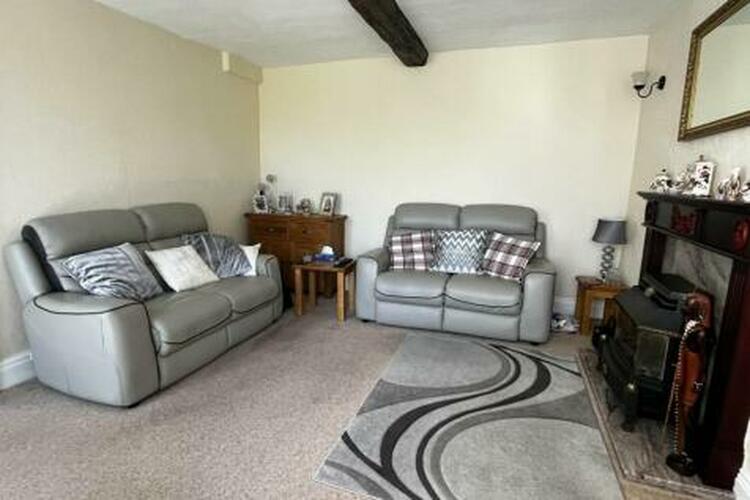 A spacious living area with a gas fire and wooden mantel with marble surround. Three large windows to the front aspect allow plenty of natural light into the room and offers lovely views of the garden.