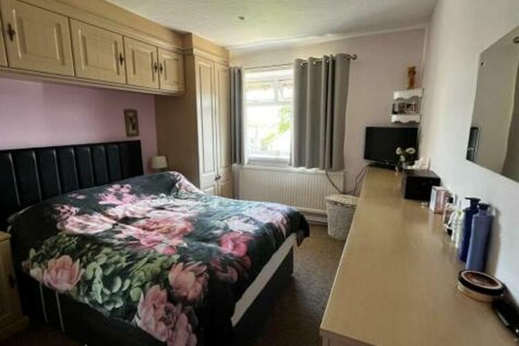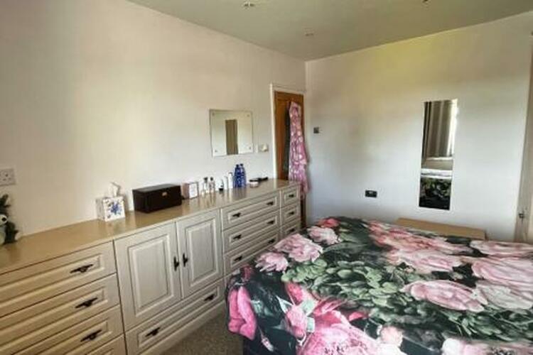 A double room with fitted wardrobes and overhead cupboards to one wall and fitted drawers to the other. A large uPVC window to the front aspect providing views of the garden and surrounding countryside.