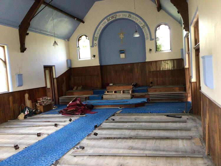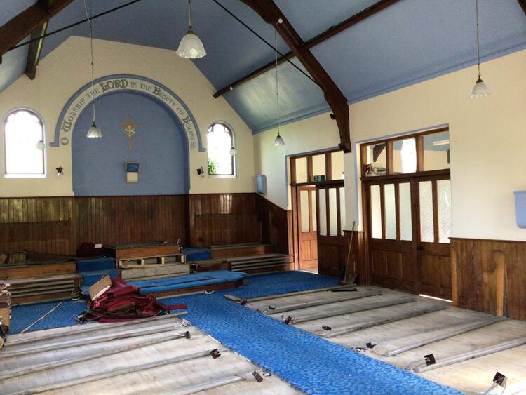 Two wooden doors open into a small entrance vestibule. Two further leaded stain glass doors open into the main reception area.