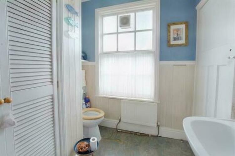 Vinyl flooring, partially tiled walls, wash hand basin with hot and cold tap, bath with hot and cold tap and hand held shower, low flush w.c., wall mounted radiator, double glazed wooden frame sash window, fitted storage cupboard(0.59m x 0.76m) housing the Ideal combination boiler.
