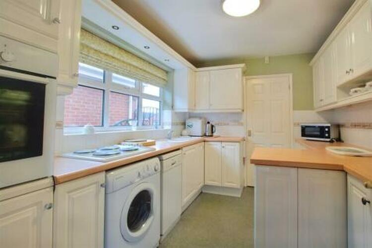 Wall, base and drawer units with roll edged work surface over, 1 and a half bowl sink and drainer with mixer tap over, tiled walls and splash backs, appliance space, plumbing for an automatic washing machine, plumbing for a dishwasher, integrated eye level oven, electric hob and extractor fan, UPVC double glazed window to the side, breakfast bar and door to the hall.