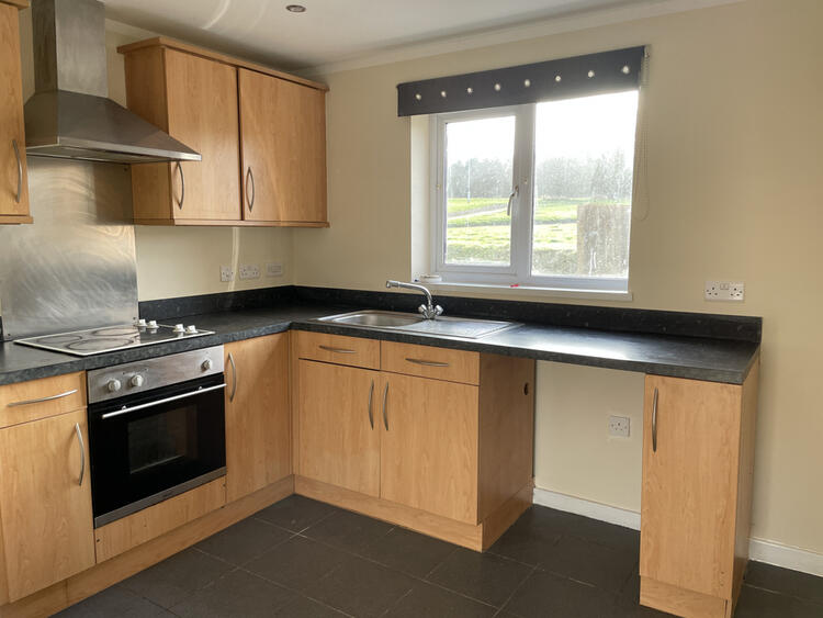 There is an open plan lounge/kitchen which is perfect for family living or entertaining. The fitted kitchen consists of wall mounted and base units with a modern work surface and floor tiling. Features include a built-in oven with hob over and extractor hood, insetted sink and drainer with mixer tap, space for washing machine and fridge freezer. The living area boasts an electric fireplace with additional electric heater, carpet flooring, spotlighting and double doors which lead into the garden.