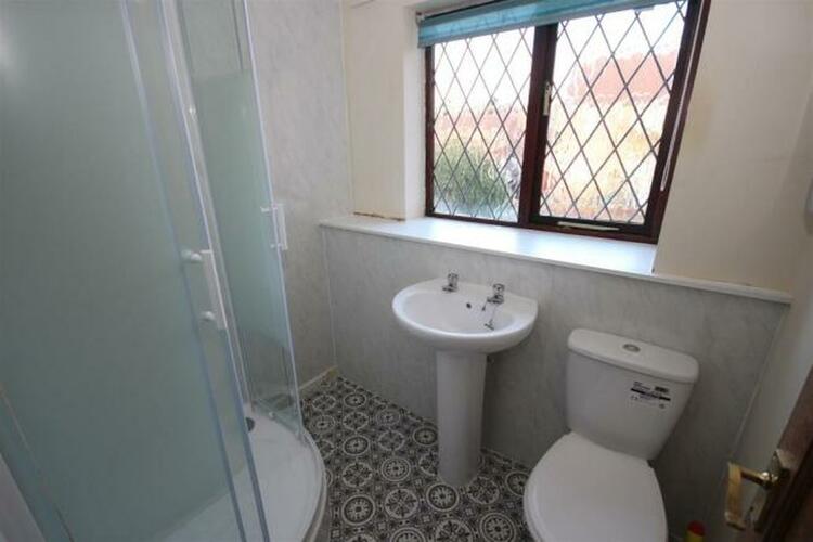 Newly fitted suite comprising low flush wc, wash hand basin and shower cubicle. Window to rear.