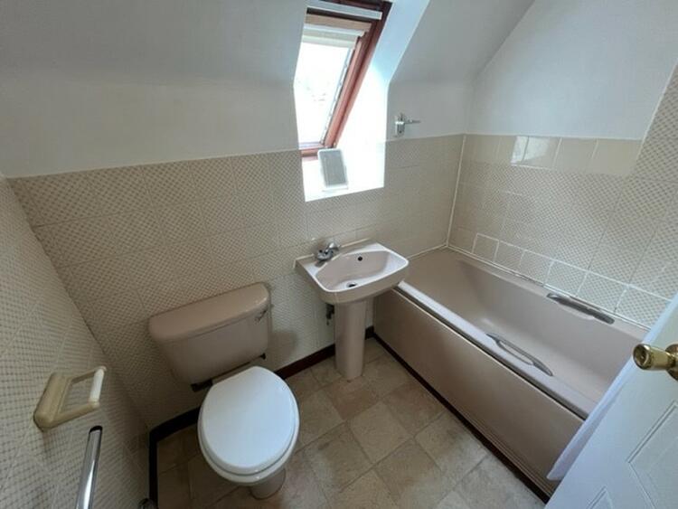 Having low flush w.c. wash hand basin and panel bath with electric shower over. Part tiled walls, heated towel rail and window to front.