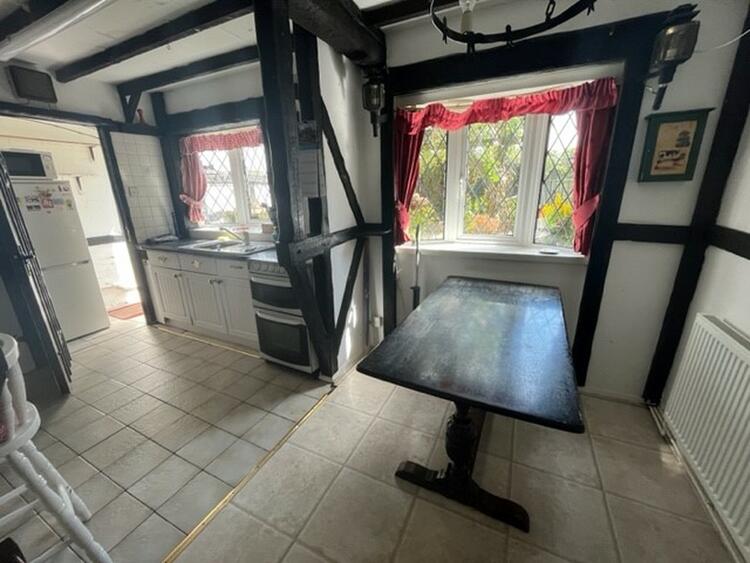 With base and wall units, sink, space for cooker, pantry with plumbing for washing machine. Space for dining table and chairs, radiator and two bow windows to rear.