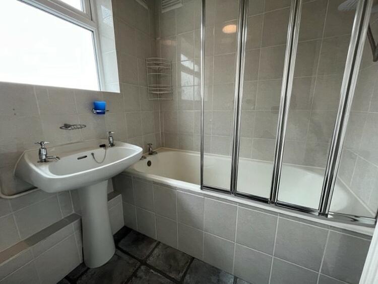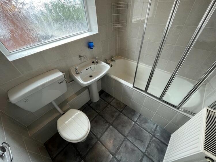 Having a white suite comprising low flush WC wash hand basin and panel bath with shower over. Part tiled walls, radiator and window to side.