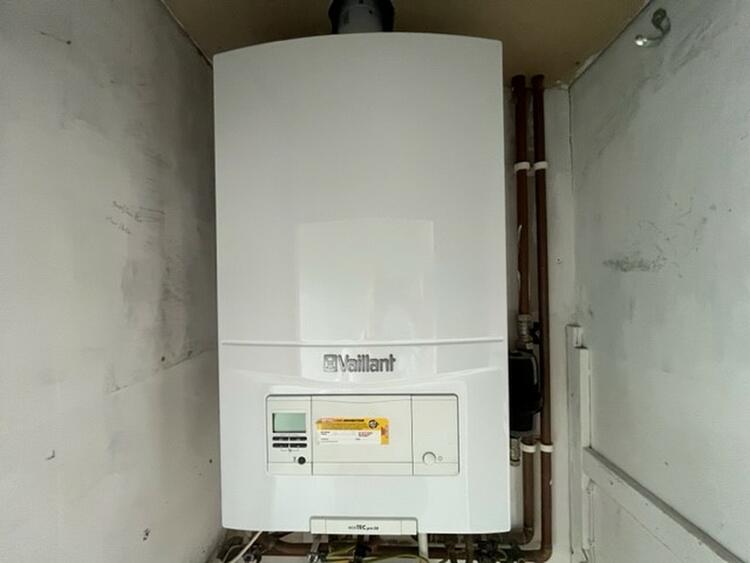 With cupboard housing the combi boiler and further cloaks storage cupboard.